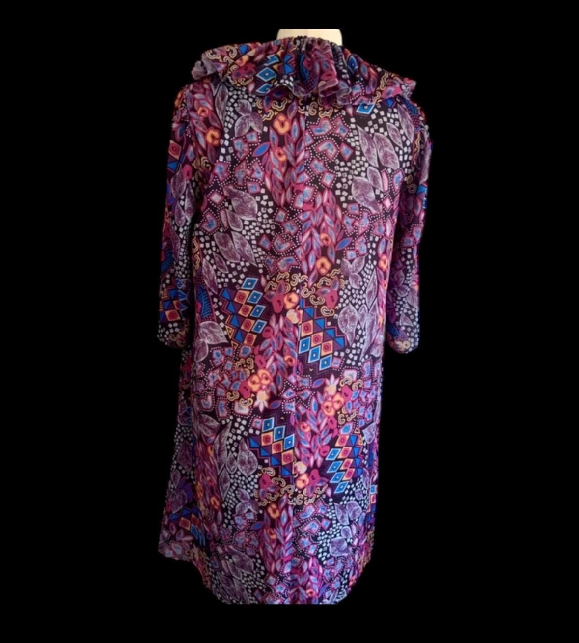 An awesome reworked vintage handmade piece, this is a beautiful smock style frock with a detachable ruffle collar in stunning hues of purple, cerise, peach, lilac and blue.